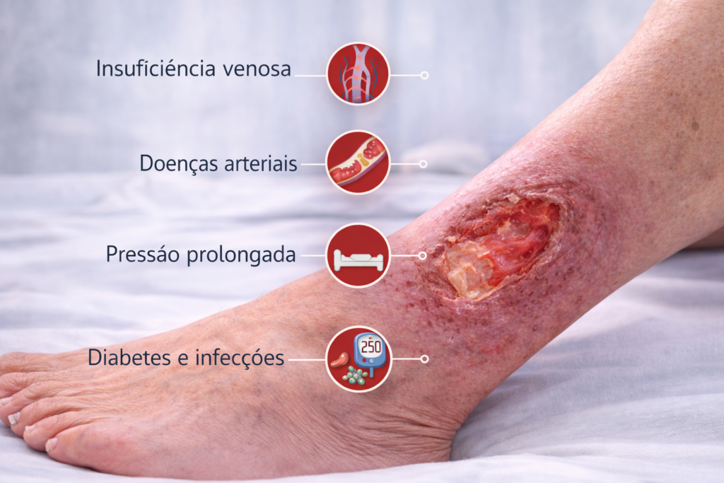 Entre as causas mais comuns estão a insuficiência venosa crônica, doenças arteriais, diabetes, pressão prolongada sobre a pele e infecções. A identificação da origem da úlcera é essencial para direcionar o tratamento correto e evitar a progressão da lesão.